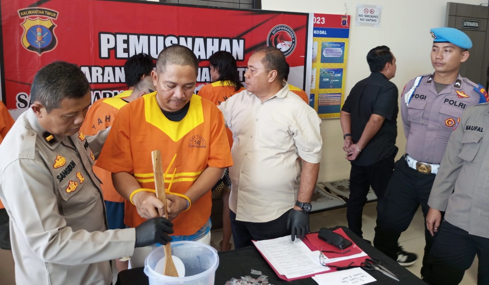 Hadir mewakili Kasat Narkoba Polresta Balikpapan, AKP Safarudin, Kasi Humas Ipda Sangidun, perwakilan Kejaksaan Negeri Balikpapan, kuasa hukum dan ke-15 tersangka.